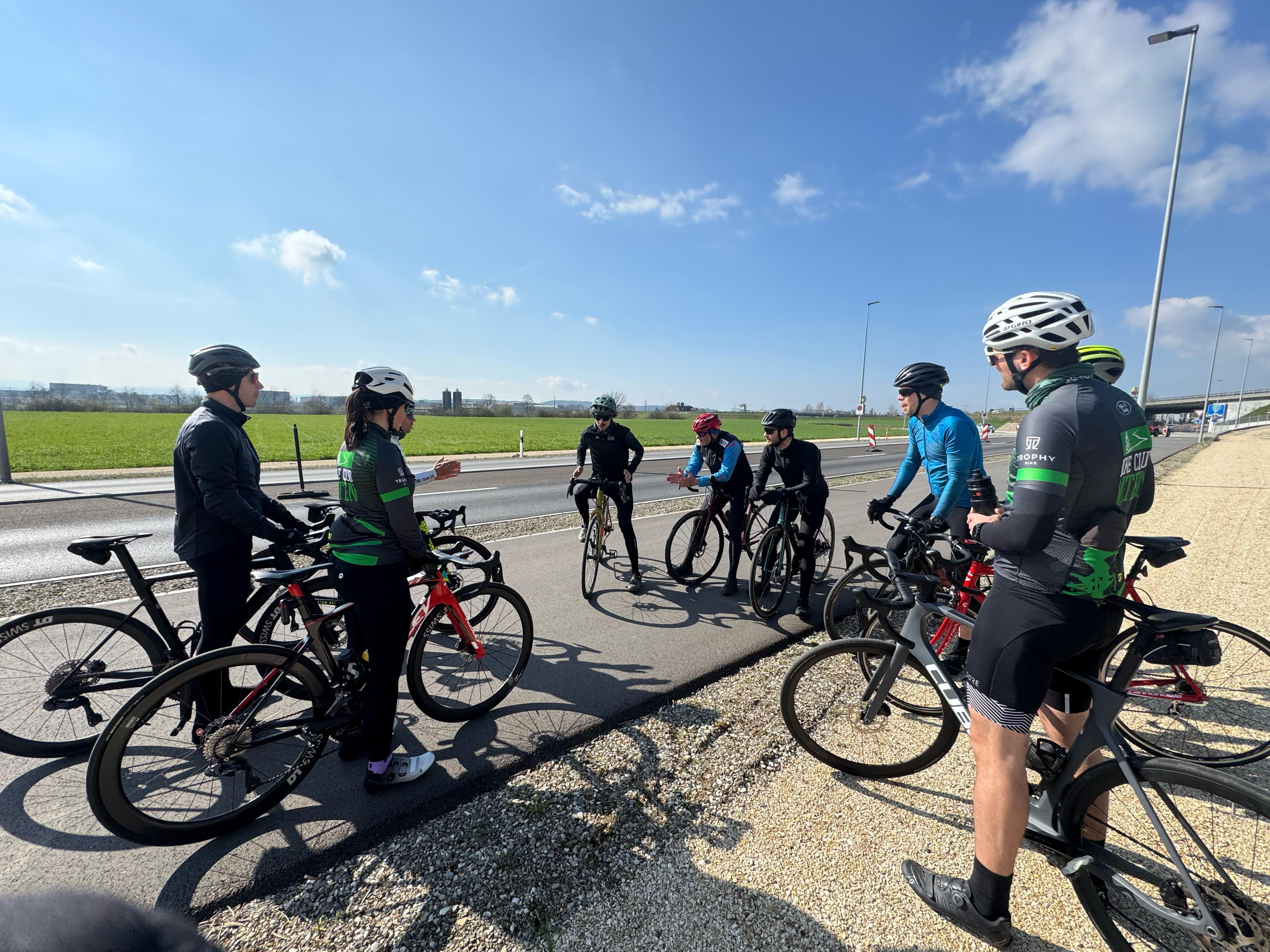 Der Name war Programm und so sind wir nur wenige Meter ins Gheid gefahren und durften dort als erstes in den Genuss des belgischen Kreisels kommen. Zuerst zu Fuss, was doch zu einigen verwunderten Passanten führte. Dann auch auf dem Velo und anfangs noch sehr lückenhaft. Teilweise taten sich richtige Elefantenlücken auf zwischen den Fahrern, wie wir im Kindergarten-Fachjargon sagen würden. Den belgischen Kreisel übten wir im wiederholten hin-und-her-fahren im Gheid und fuhren dann weiter über Kappel nach Hägendorf. Auf dem gut abgetrennten Veloweg zwischen Hägendorf und Egerkingen übten wir dann weiter und lernten auch die Zweier-Ablösung kennen. Man fährt immer zu zweit nebeneinander und die vordersten zwei lassen sich nach gewünschter Zeit rechts und links der Gruppe nach hinten fallen, um den wohlverdienten Windschatten zu geniessen.