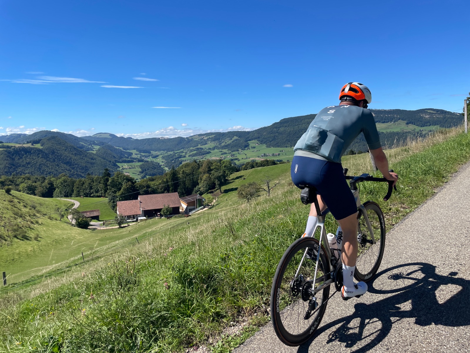 In Mümliswil klinkte sich Nicole aus und entschied sich direkt nach Balsthal zu fahren, um einen Kaffee zu trinken. Die restliche Gruppe nahm sich den Brunnersberg vor. Knackige Anstiege und erholsame «Bödeli» wechselten sich ab und wir näherten uns rasant dem Gipfel. Leider bremste uns der Platten von Armin aus, wodurch unser Traum vom KOM platzte. Als Retter in der Not konnte sich dann Marci, der zufälligerweise mit dem Mountainbike in der Region unterwegs war, in Szene setzen und den Platten professionell flicken. Währenddessen zog Res mit einem stoischen Tramp an der Gruppe vorbei und liess die Gruppe stehen. Zur gleichen Zeit entschied sich Nicole in Balsthal gegen den Kaffee und startete den Aufstieg von der anderen Seite auf den Brunnersberg.