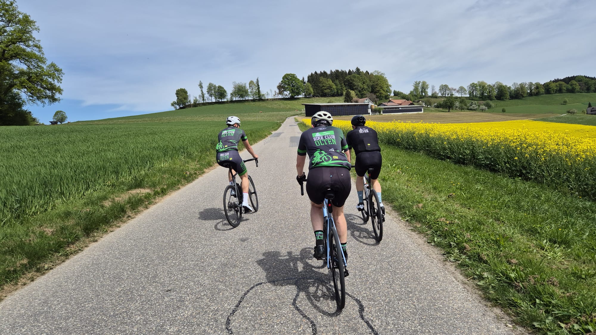 Das Einrollen begann mit einer, durch den Rückenwind begünstigten, hohen Geschwindigkeit. Um dem Motto «Social Ride»* gerecht zu werden wurde das Tempo danach etwas gedrosselt und wir fuhren Richtung durch flaches Terrain nach Herzogenbuchsee. Durch einen Schlenker hatten wir danach den Wind im Gesicht, doch dank des coupierten Geländes hielt sich dessen Einfluss in Grenzen.